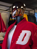 Upgrade your style with the Delta Big Motion Varsity Jacket. Show off your sorority pride with the embroidered chenille patch "D". This jacket is also customizable, adding a personal touch to your look. Make a statement with each wear.