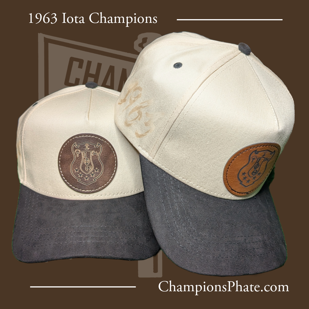 Our high-quality A-frame cap, designed for style and durability. This off-white cap features a premium suede brim and top button, delivering a sleek and modern look. Each hat includes a random pin that complements the color scheme, along with a signature nickel-plated Champion's Phate pin. What truly sets this cap apart is Iota Phi Theta's founding year burned into the hat, making it a unique and personal statement piece. Elevate your headwear collection with this standout accessory—crafted for those who appreciate bold style and quality craftsmanship!